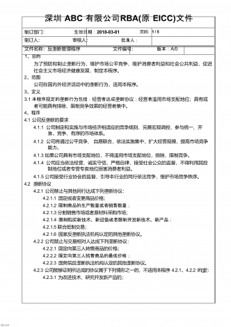 深圳ABC有限公司RBA(原EICC)文件制订部门:生效日期:2018-03-01页码:1/5制订人:审核人:批准人:文件名称:反垄断管理程序文件编号:版本:A/01、目的为了预防和制止垄断行为,维护市场公平竞争,维护消费者利益和社会公共利益,促进社会主义市场经济健康发展,制定本程序。2、范围公司在国内外经济活动中的垄断行为,适用本程序。3、定义3.1本程序定的断行包括:者达成断;者规垄为经营垄协议经营滥用市场支配地位;具有或者可能具有排除、限制竞争效果的经营者集中。4、程序4.1公司反垄断的要...