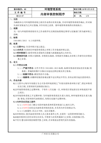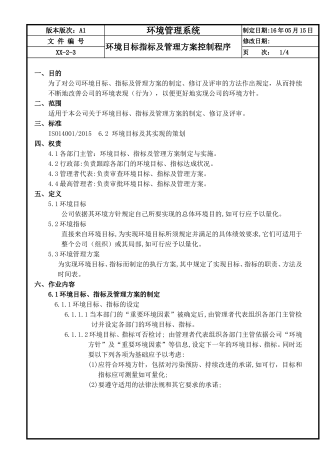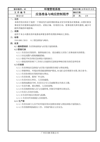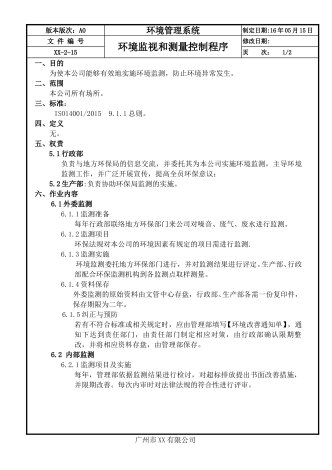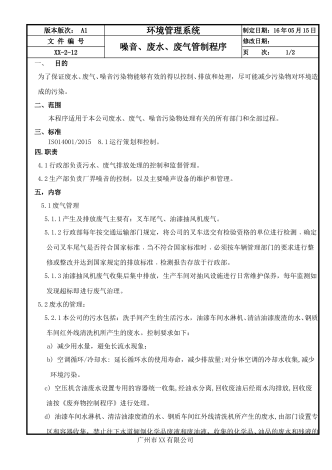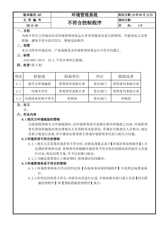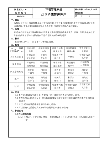 版本版次:A0环境管理系统制定日期:16年05月15日文件编号预防措施管理程序修改日期:xx-2-21页次:1/2一、目的为确保公司在环境管理体系运行中尚未发生的不符合事项或潜在的不符合因素能及时有效地消除,降低其影响,防止再发,明确有关各项活动的职责,从而达到持续改善之目的。二、范围凡是本公司在环境管理体系运行中经测量或监控所发现的或由客户、社区、邻居及相关政府部门所投诉之不符合项与潜在不符合项之处理作业均适用。三、标准ISO14001/201510.2不符合和纠正措施。四、权责4.1环境异常...