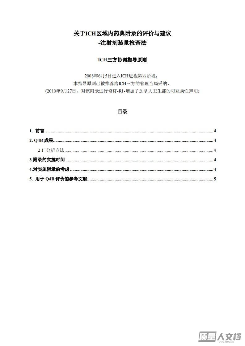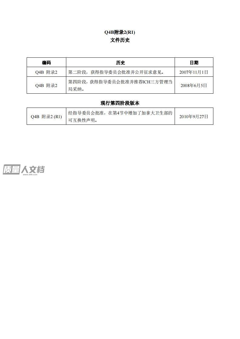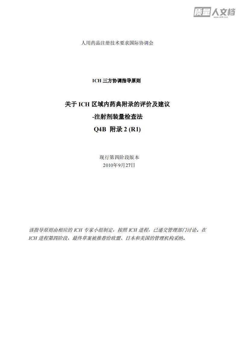 人用药品注册技术要求国际协调会ICH三方协调指导原则关于ICH区域内药典附录的评价及建议-注射剂装量检查法Q4B附录2(R1)现行第四阶段版本2010年9月27日该指导原则由相应的ICH专家小组制定,按照ICH进程,已递交管理部门讨论。在ICH进程第四阶段,最终草案被推荐给欧盟、日本和美国的管理机构采纳。Q4B附录2(R1)文件历史编码历史日期Q4B附录2第二阶段,获得指导委员会批准并公开征求意见。2007年11月1日Q4B附录2第四阶段,获得指导委员会批准并推荐ICH三方管理当局采纳。2008年6月5日现行第四阶段版本Q4B附录2(R1)经指导委员会批准,在第4节中增加了加拿大卫生部的可互换...