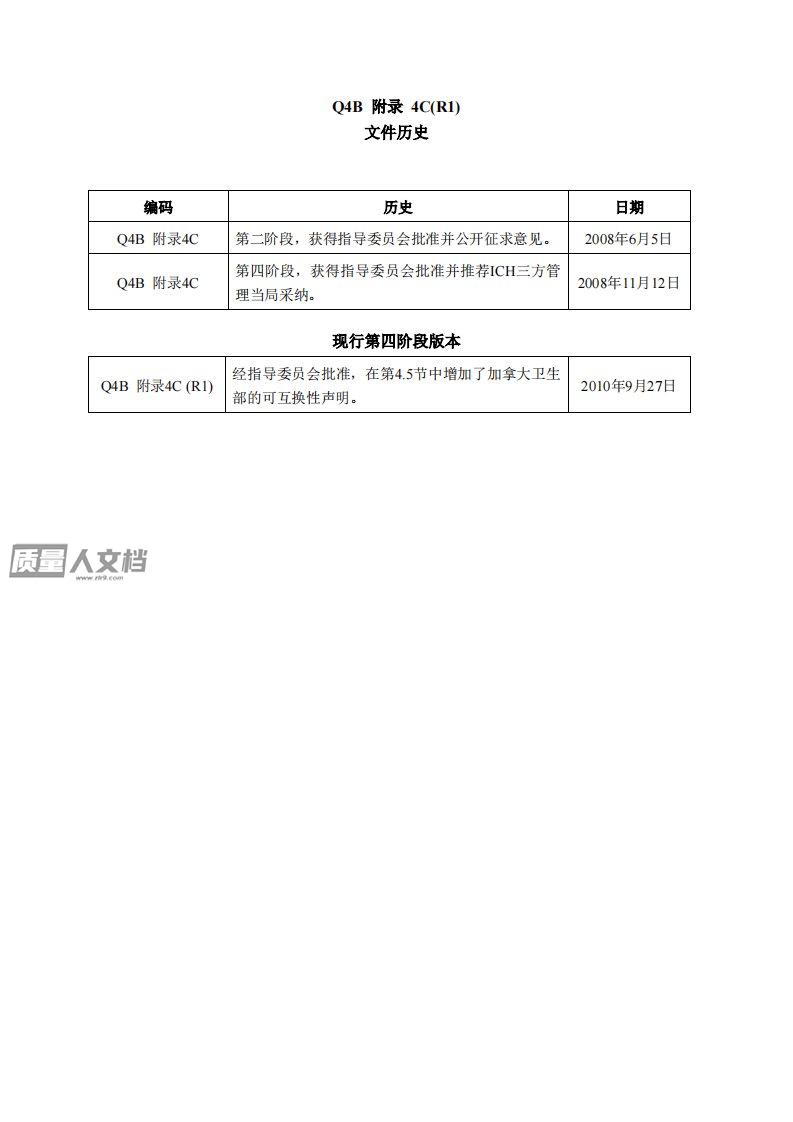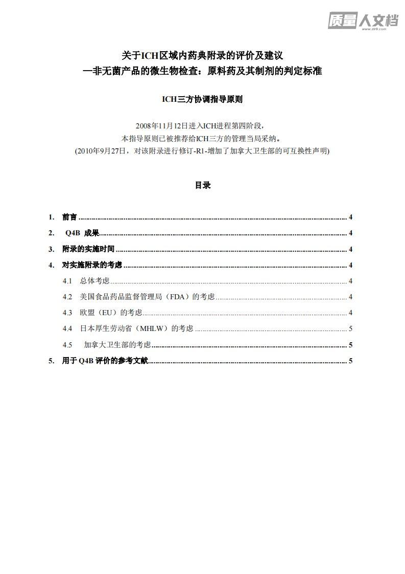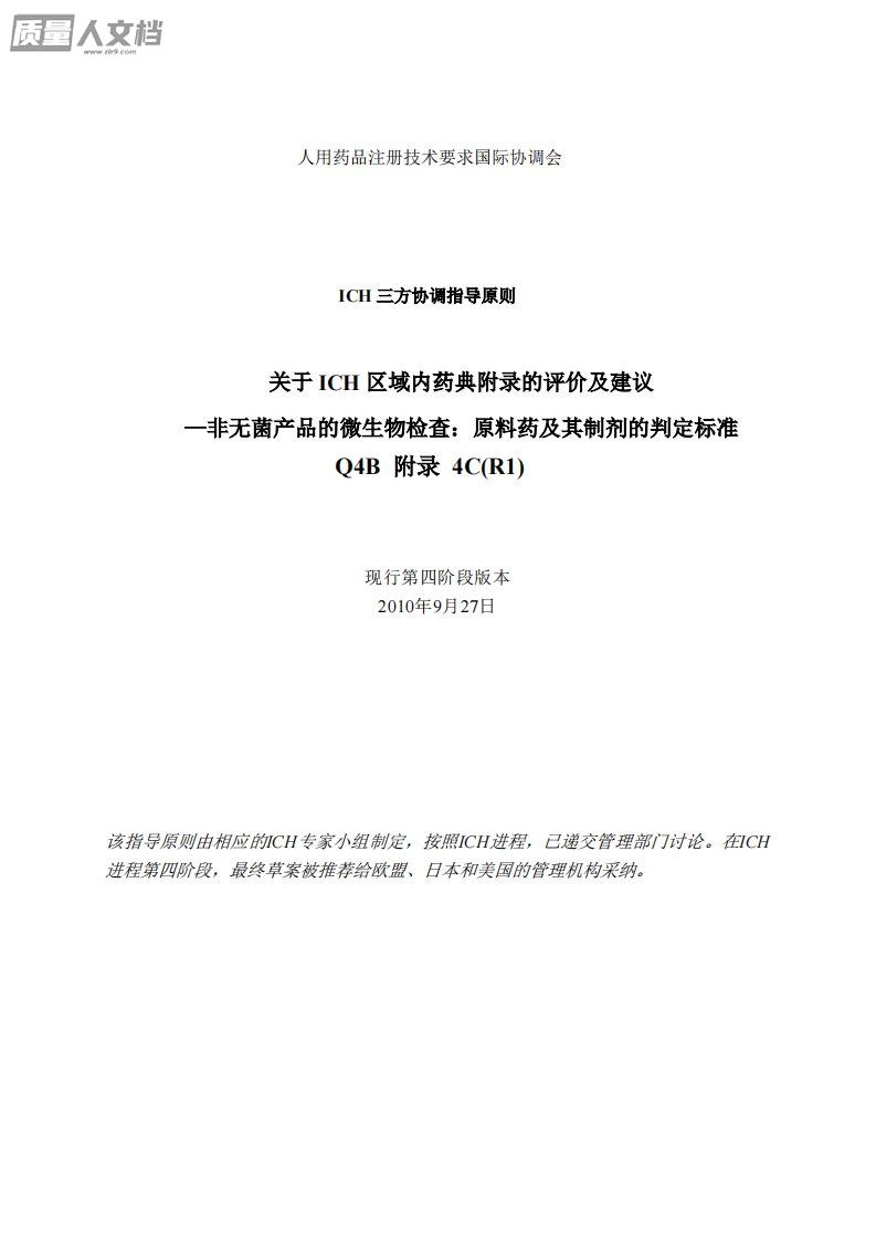 人用药品注册技术要求国际协调会ICH三方协调指导原则关于ICH区域内药典附录的评价及建议—非无菌产品的微生物检查:原料药及其制剂的判定标准Q4B附录4C(R1)现行第四阶段版本2010年9月27日该指导原则由相应的ICH专家小组制定,按照ICH进程,已递交管理部门讨论。在ICH进程第四阶段,最终草案被推荐给欧盟、日本和美国的管理机构采纳。Q4B附录4C(R1)文件历史编码历史日期Q4B附录4C第二阶段,获得指导委员会批准并公开征求意见。2008年6月5日Q4B附录4C第四阶段,获得指导委员会批准并推荐ICH三方管理当局采纳。2008年11月12日现行第四阶段版本Q4B附录4C(R1)经指导委员...