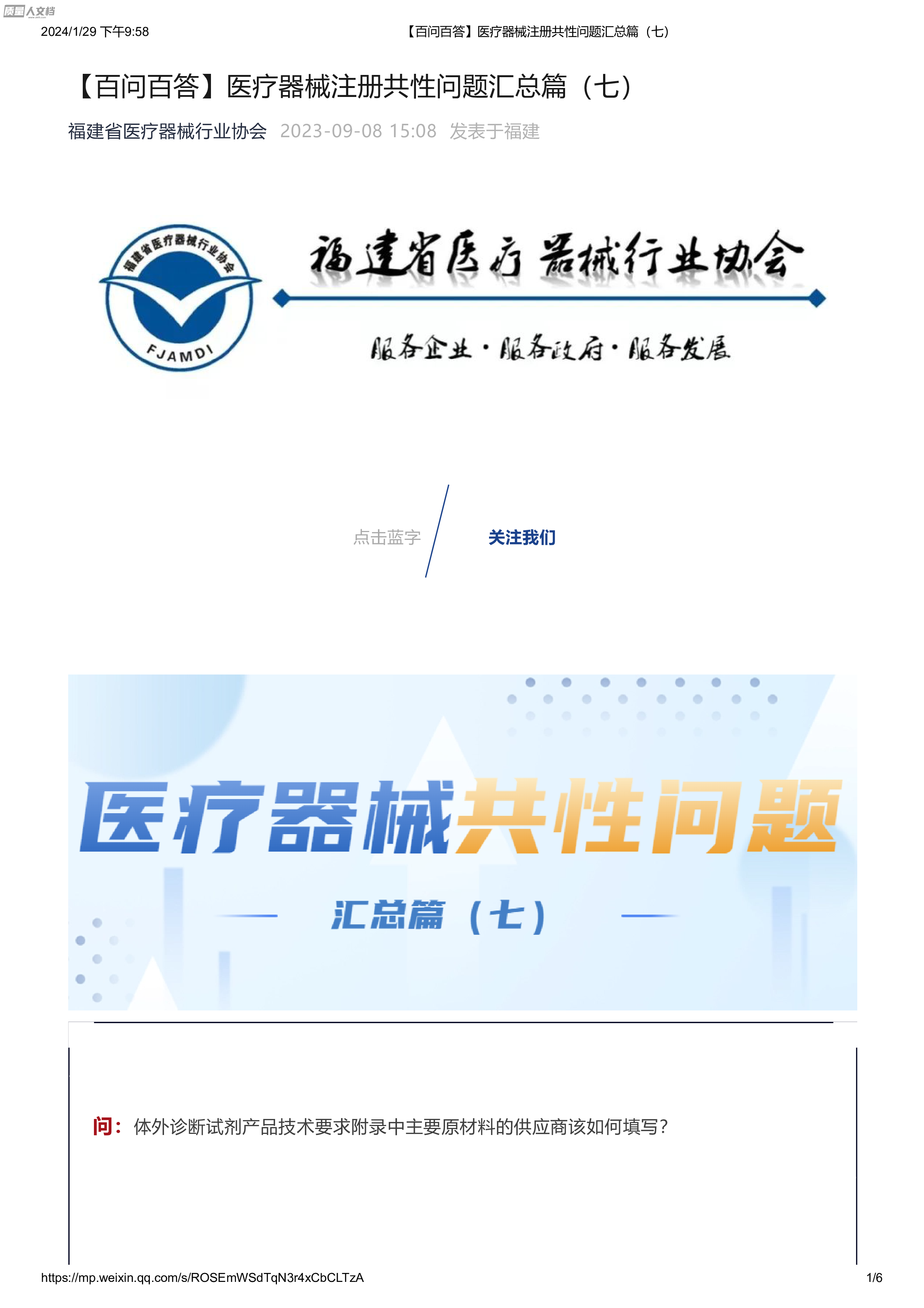 2024/1/29下午9:58【百问百答】医疗器械注册共性问题汇总篇(七)https://mp.weixin.qq.com/s/ROSEmWSdTqN3r4xCbCLTzA1/6【百问百答】医疗器械注册共性问题汇总篇(七)点击蓝字问:体外诊断试剂产品技术要求附录中主要原材料的供应商该如何填写?关注我们2023-09-0815:08发表于福建福建省医疗器械行业协会2024/1/29下午9:58【百问百答】医疗器械注册共性问题汇总篇(七)https://mp.weixin.qq.com/s/ROSEmWSdTqN3r4xCbCLTzA2/6答:体外诊断试剂产品技术要求附录中要求标注主要原材料的来源...