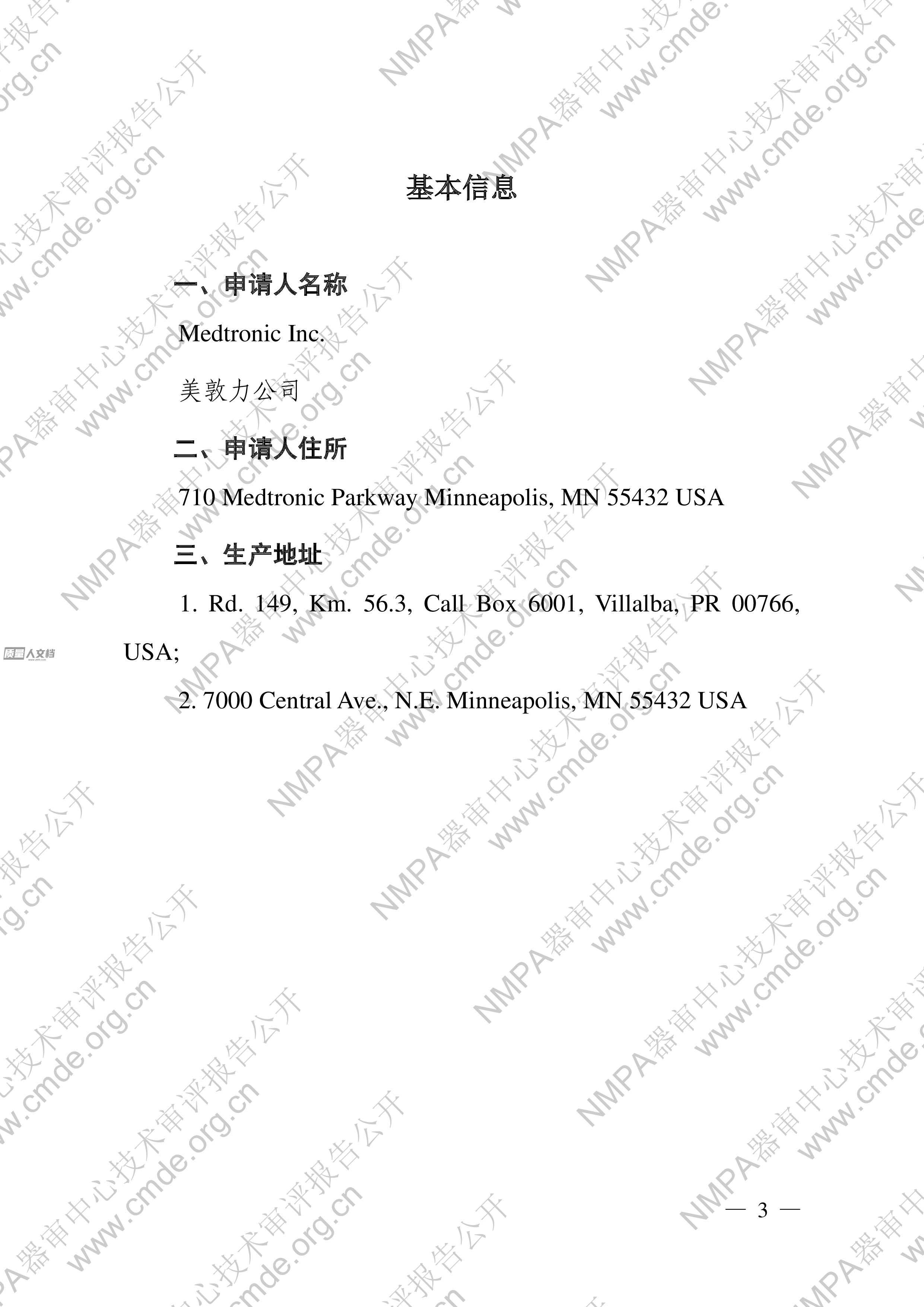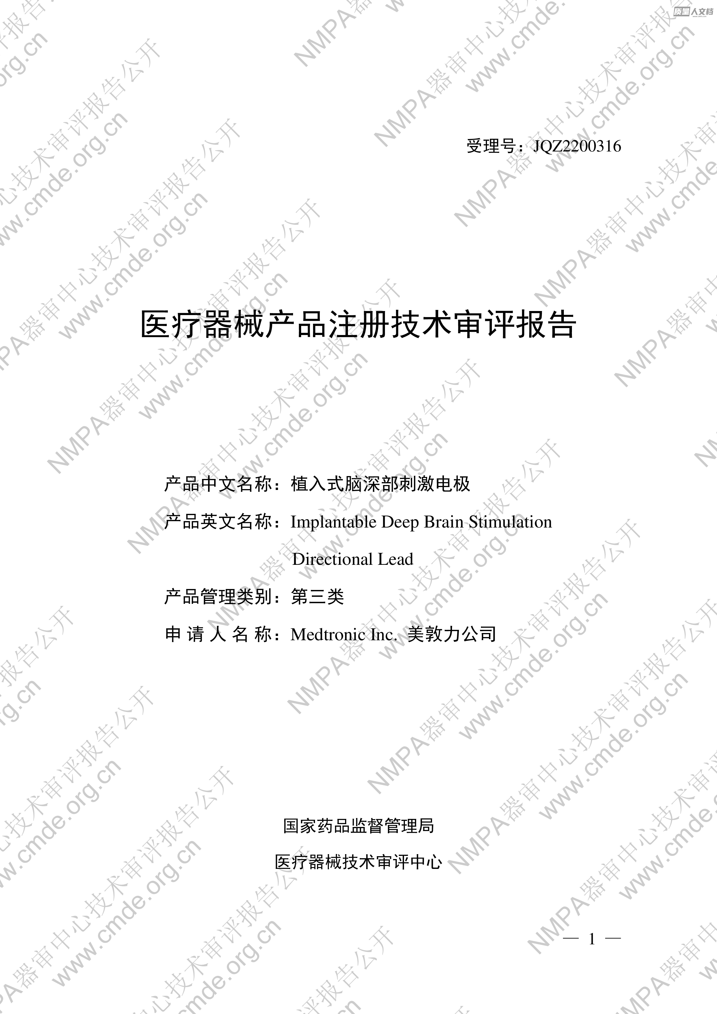 —1—受理号:JQZ2200316医疗器械产品注册技术审评报告产品中文名称:植入式脑深部刺激电极产品英文名称:ImplantableDeepBrainStimulationDirectionalLead产品管理类别:第三类申请人名称:MedtronicInc.美敦力公司国家药品监督管理局医疗器械技术审评中心—2—目录基本信息.........................................................................................................3一、申请人名称...........................
