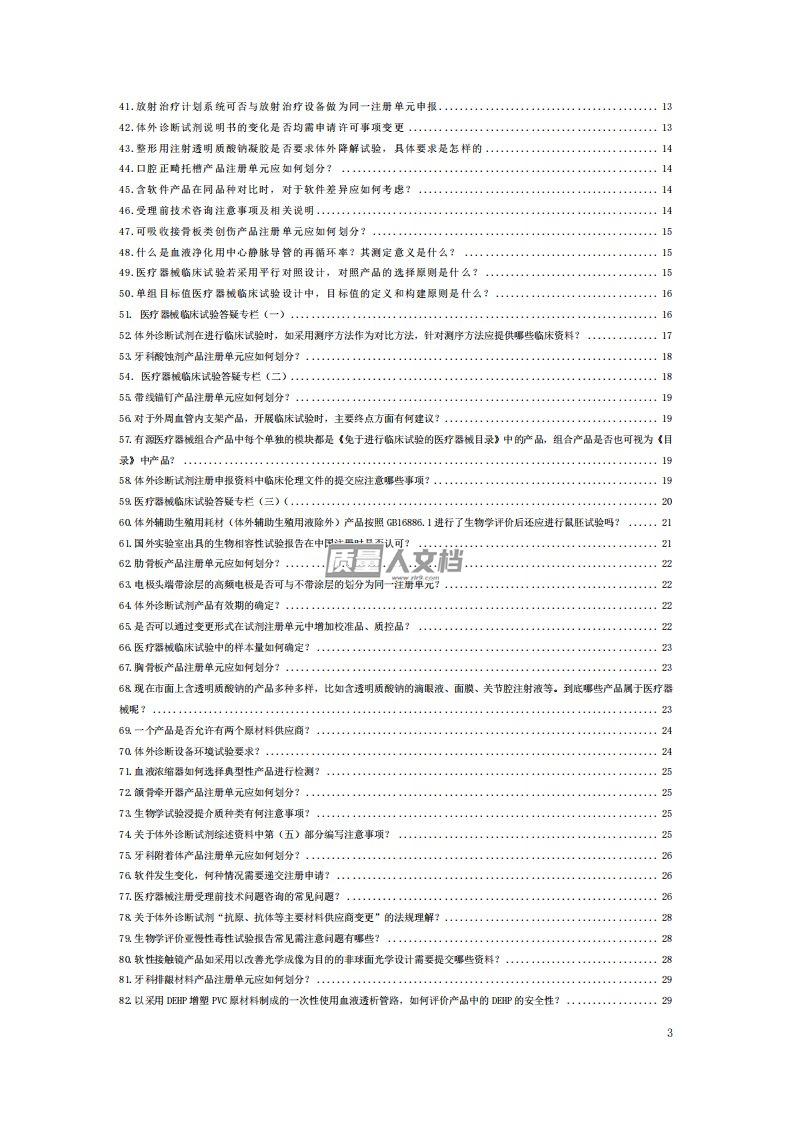 1医疗器械答疑解惑汇总更新至:2020年4月2目录1.新研制的尚未列入分类目录的医疗器械,是否一定要在注册申报前进行分类界定?.........................12.关于体外诊断试剂临床试验入组病例样本的常见问题。...................................................13.产品在进行化学性能研究时,某项化学性能(例如还原物质)出现异常,需如何进行评价?................24.确定有源医疗器械的使用期限应该考虑哪些因素?应提交哪些资料?......................................25.可...