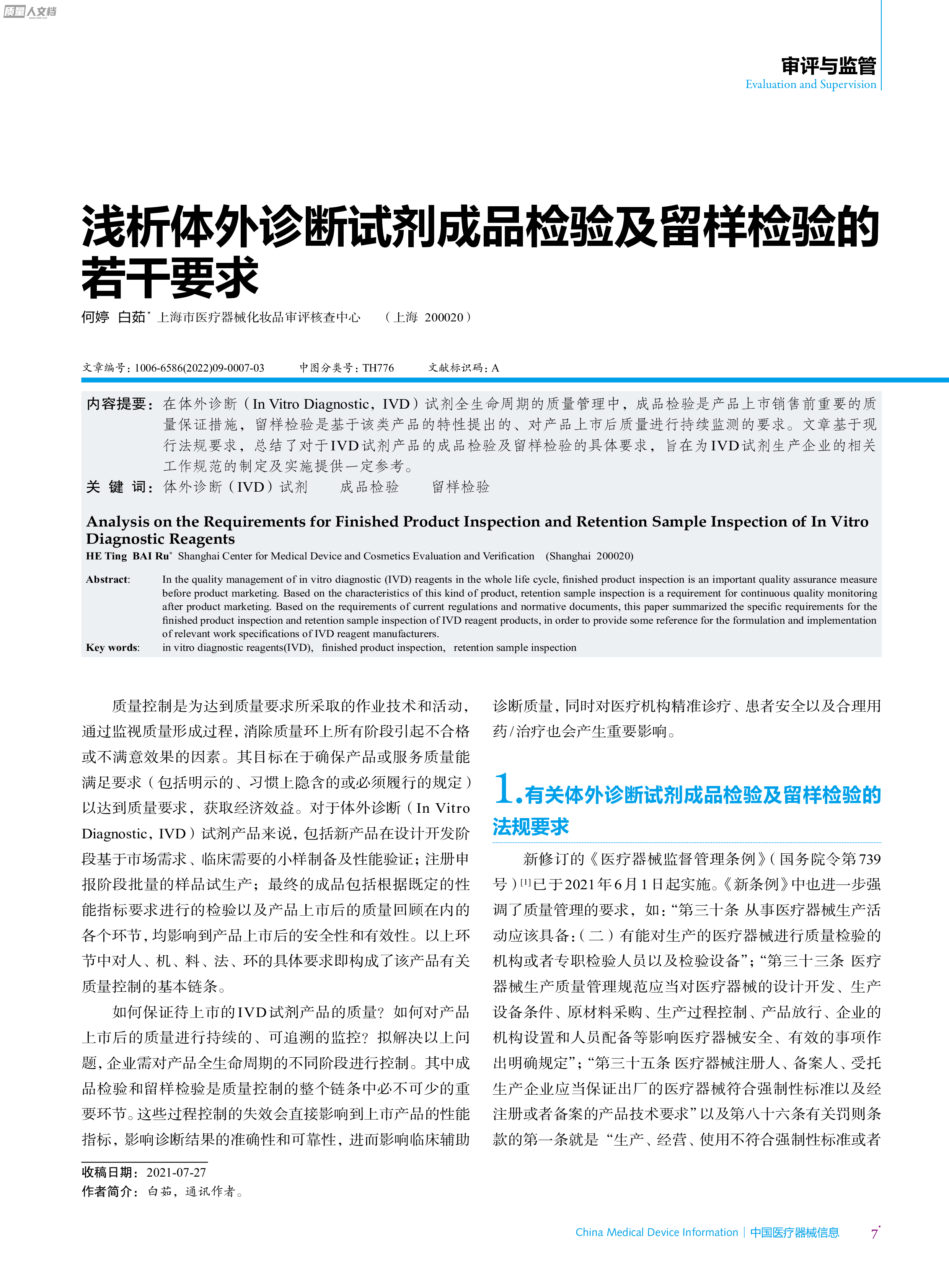 浅析体外诊断试剂成品检验及留样检验的若干要求