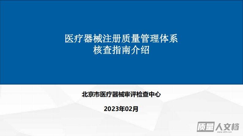 医疗器械注册质量管理体系核查指南介绍北京市医疗器械审评检查中心2023年02月目录/Contents01背景、依据和适用范围02内容介绍01背景、依据和目的医疗器械注册质量管理体系核查指南法律法规规章规范性文件指导原则指南文件宪法•医疗器械委托生产质量协议编制指南(2022年第20号)•医疗器械质量管理体系年度自查报告编写指南(2022年第13号)•……国家•北京市医疗器械病毒灭活工艺检查指南(2022版)•北京市植入性医疗器械生产质量管理规范检查指南(2022版)•……北京医疗器械注册质量管理体系核查指南背景•百年未有之大变局,世界经济发展下行状况不断加剧•服务发展,服务上市•技术审评为主导...