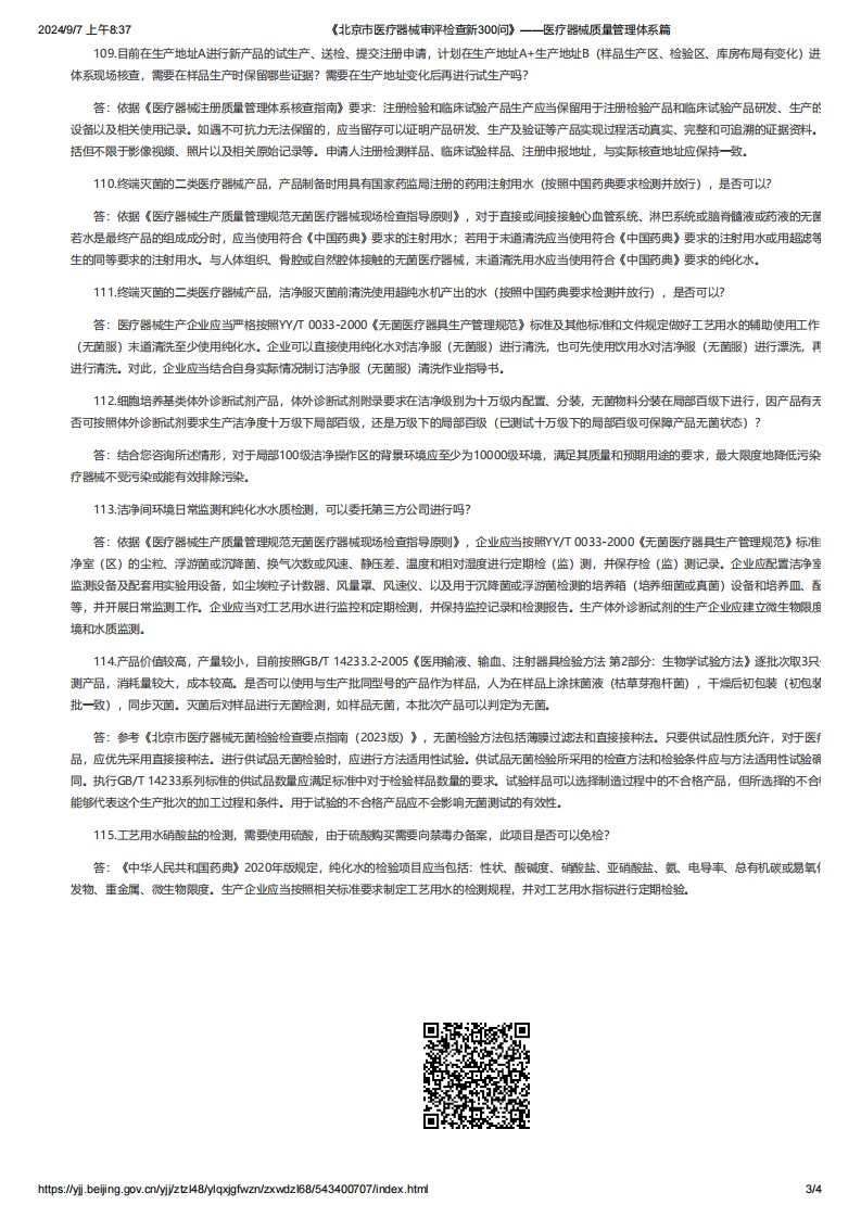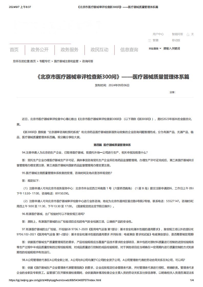 2024/9/7上午8:37《北京市医疗器械审评检查新300问》——医疗器械质量管理体系篇https://yjj.beijing.gov.cn/yjj/ztzl48/ylqxjgfwzn/zxwdzl68/543400707/index.html1/4您所在的位置:首页>专题专栏>医疗器械注册和监管>咨询问答《北京市医疗器械审评检查新300问》——医疗器械质量管理体系篇发布时间:2024年09月06日分享: 近日,北京市医疗器械审评检查中心精心推出《北京市医疗器械审评检查新300问》(以下简称《新300问》),是对2023年版本的全面优化、展。 《新300问》是根据“北京器审咨询和...