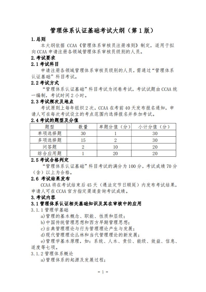中国认证认可协会管理体系认证基础考试大纲第1版文件编号:CCAA-TR-102-01:2021发布日期:2021年3月2日实施日期:2021年4月1日-1-管理体系认证基础考试大纲(第1版)1.总则本大纲依据CCAA《管理体系审核员注册准则》制定,适用于拟向CCAA申请注册各领域管理体系审核员级别的人员。2.考试要求2.1考试科目申请注册各领域管理体系审核员级别的人员,需通过“管理体系认证基础”科目考试。2.2考试方式“管理体系认证基础”科目考试为闭卷考试,考试试题由CCAA统一编制,考试时间2小时。2.3考试频次及地点考试原则上每年组织2次,CCAA在考前40天发布报名通知,申请人可在每次考...