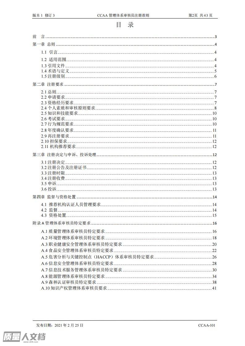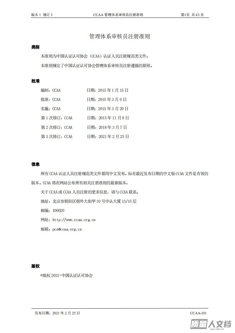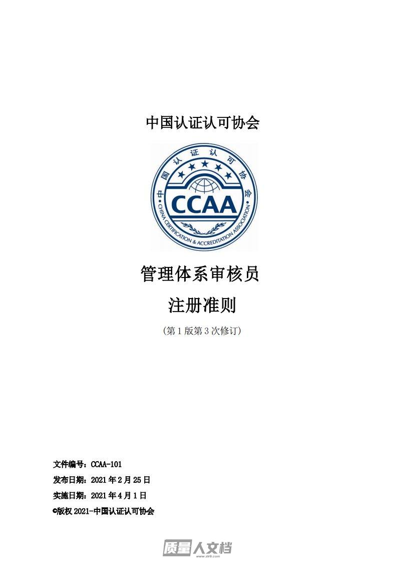 中国认证认可协会管理体系审核员注册准则(第1版第3次修订)文件编号:CCAA-101发布日期:2021年2月25日实施日期:2021年4月1日©版权2021-中国认证认可协会版本1修订3CCAA管理体系审核员注册准则第1页共43页发布日期:2021年2月25日CCAA-101管理体系审核员注册准则类别本准则为中国认证认可协会(CCAA)认证人员注册规范类文件。本准则规定了中国认证认可协会管理体系审核员注册遵循的原则。批准编制:CCAA日期:2015年1月15日批准:CCAA日期:2015年3月6日实施:CCAA日期:2015年3月20日第1次修订:CCAA日期:2015年11月9日第2次修订:...