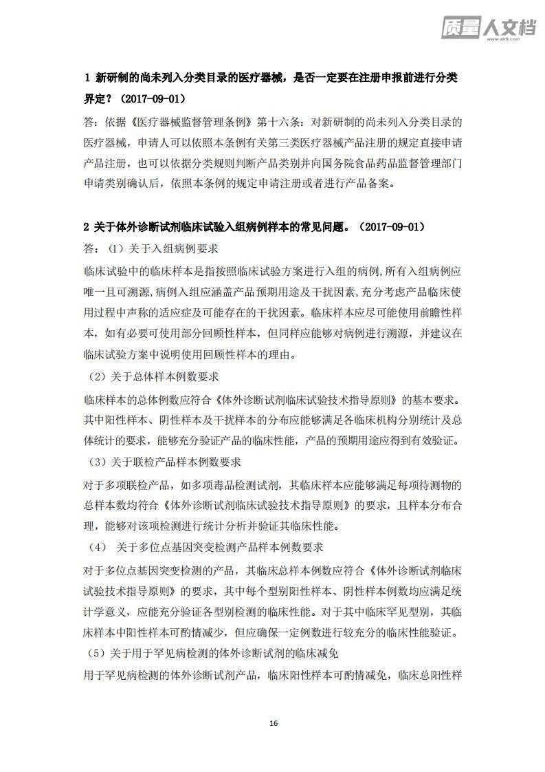 1中国医疗器械器审中心答疑解惑汇总5.2版/2024年11月27日161新研制的尚未列入分类目录的医疗器械,是否一定要在注册申报前进行分类界定?(2017-09-01)答:依据《医疗器械监督管理条例》第十六条:对新研制的尚未列入分类目录的医疗器械,申请人可以依照本条例有关第三类医疗器械产品注册的规定直接申请产品注册,也可以依据分类规则判断产品类别并向国务院食品药品监督管理部门申请类别确认后,依照本条例的规定申请注册或者进行产品备案。2关于体外诊断试剂临床试验入组病例样本的常见问题。(2017-09-01)答:(1)关于入组病例要求临床试验中的临床样本是指按照临床试验方案进行入组的病例,所有入组...