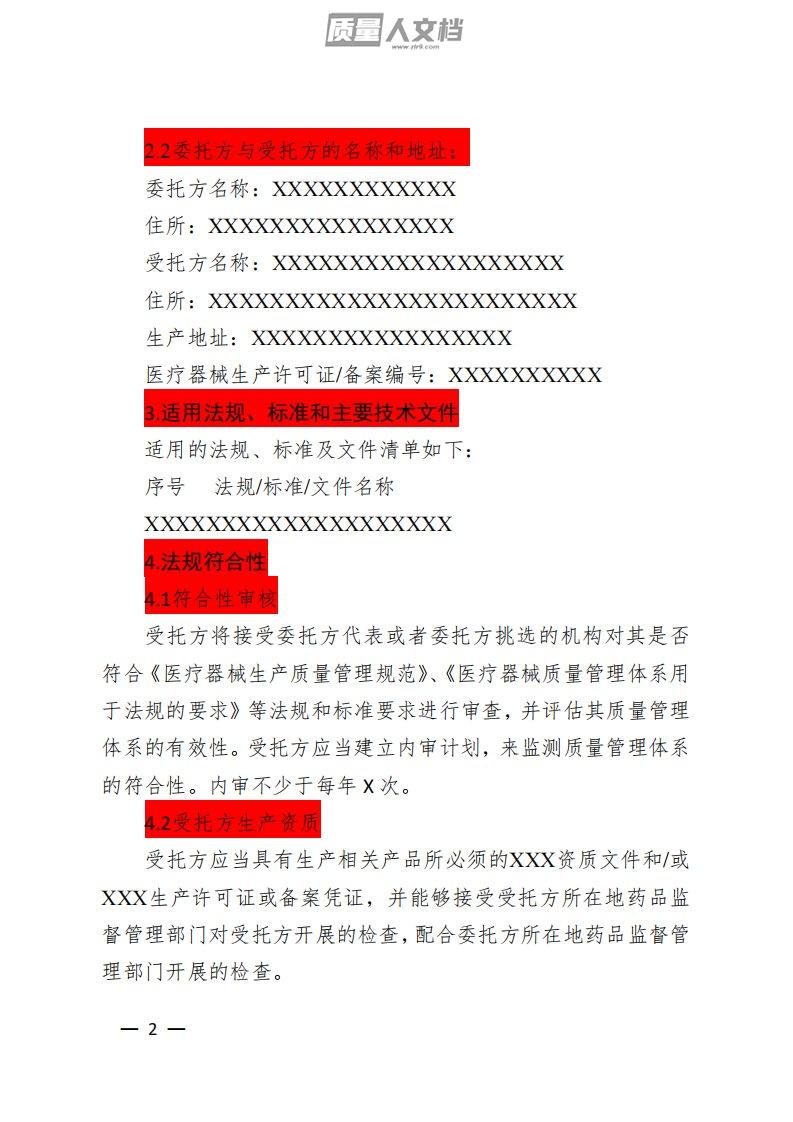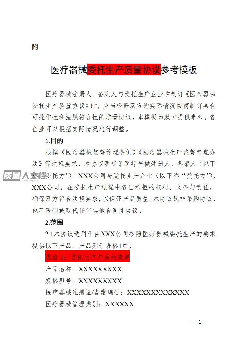 ——1——附医疗器械委托生产质量协议参考模板医疗器械注册人、备案人与受托生产企业在制订《医疗器械委托生产质量协议》时,应当根据双方的实际情况协商制订具有可操作性和法规符合性的质量协议。本模板为双方提供参考,各企业可以根据实际情况进行调整。1.目的根据《医疗器械监督管理条例》《医疗器械生产监督管理办法》等法规要求,本协议明确了医疗器械注册人、备案人(以下称“委托方”):XXX公司与受托生产企业(以下称“受托方”):XXX公司,在委托生产过程中各自承担的权利、义务与责任,确保双方符合法规要求,以保证产品质量。本协议既非采购协议,也不限制或取代任何其他合同性协议。2.范围2.1本协议适用于由XXX公...