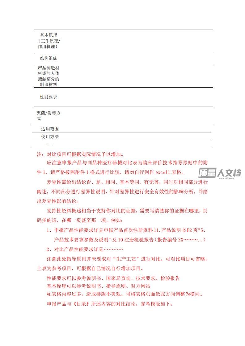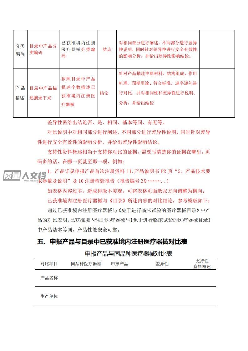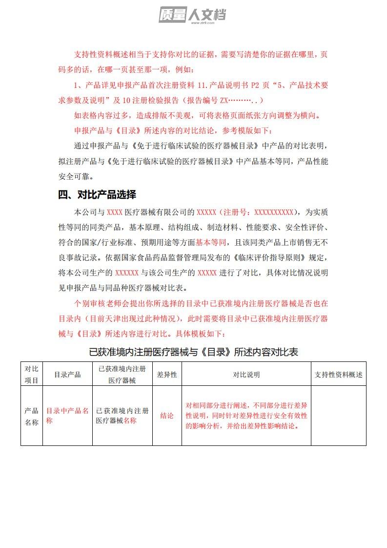 支持性资料概述相当于支持你对比的证据,需要写清楚你的证据在哪里,页码多的话,在哪一页甚至那一项,例如:1、产品详见申报产品首次注册资料11.产品说明书P2页“5、产品技术要求参数及说明”及10注册检验报告(报告编号ZX………..)如表格内容过多,造成排版不美观,可将表格页面纸张方向调整为横向。申报产品与《目录》所述内容的对比结论,参考模版如下:通过申报产品与《免于进行临床试验的医疗器械目录》中产品的对比表明,拟注册产品与《免于进行临床试验的医疗器械目录》中产品基本等同,产品性能安全可靠。四、对比产品选择本公司与XXXX医疗器械有限公司的XXXXX(注册号:XXXXXXXXXX),为实质性等同的...
