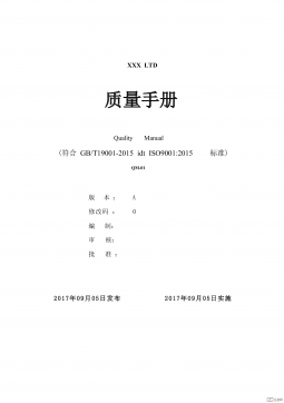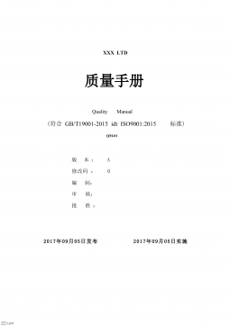 XXXLTD质量手册QualityManual(符合GB/T19001-2015idtISO9001:2015标准)QM-01版本:A修改码:0编制:审核:批准:2017年09月05日发布2017年09月05日实施说明:1.该套文件适用于ISO9001:2015以及各大欧美质量验厂,包括SQP,沃尔玛FCCA,家乐福,KMART,TARGET,利丰,COSTCO,TESCO,家得宝等客户的质量验厂。2.前24个程序IS09001:2015专用。3.后26个程序为客户质量验厂的补充,不列入IS09001:2015的程序。4.主要方便ISO09001:2015改版用,能省点辅导费;以及应付客户验厂...