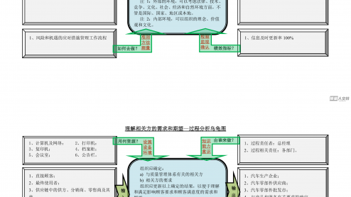 知识能力意识由谁来做?检验监视确认绩效指标?用何资源?如何去做?准则方法测量设施设备环境知识能力意识由谁来做?检验监视确认绩效指标?用何资源?如何去做?准则方法测量设施设备环境理解组织及其背景环境—过程分析乌龟图理解相关方的需求和期望—过程分析乌龟图组织应确定外部和内部那些与组织的宗旨、战略方向有关、影响质量管理体系实现预期结果的能力的事务。需要时,组织应更新这些信息。在确定这些相关的内部和外部事宜时,组织应考虑以下方面:a)可能对组织的目标造成影响的变更和趋势;b)与相关方的关系,以及相关方的理念、价值观;c)组织管理、战略优先、内部政策和承诺;d)资源的获得和优先供给、技术变更。注1:外部...