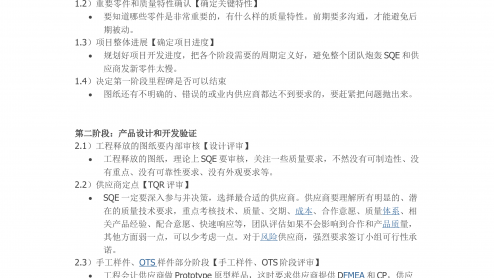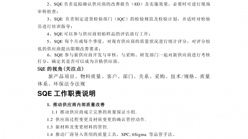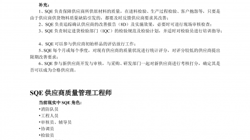 SQE供货商管理工程师——(SupplierQualityEngineer)1、必须要有供应商跟踪的方式,质量问题独立处理的方法;2、高级职位必须要有成本控制、质量控制管理的清晰思路与意识、坚持的原则底线;3、供应商的内部品质管理流程、以及可能出现的问题对应方式。4、稳定性的保证手段。补充:1、SQE负责保障供应商所供原材料的质量,在进料检验、生产过程检验、客户抱怨等,只要是由于供应商供货物料质量缺陷引发的,都要及时反馈供应商要求其改善;2、SQE负责追踪确认供应商的改善报告(8D)及实施效果,必要时可进行现场审核检查;3、SQE负责制定进货检验部门(IQC)的检验规范及检验计划,并适时对检验...
