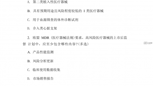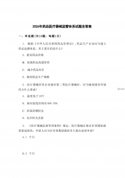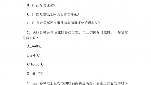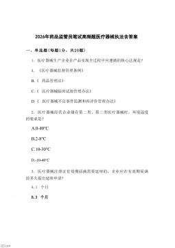2026年药品监管员笔试高频题医疗器械执法含答案一、单选题(每题1分,共20题)1.医疗器械生产企业在产品实现全过程中应遵循的核心法规是?A.《医疗器械监督管理条例》B.《药品管理法》C.《医疗器械临床试验管理办法》D.《医疗器械不良事件监测和再评价管理办法》2.医疗器械经营企业储存第二类、第三类医疗器械时,环境温度的要求是?A.0-40℃B.2-8℃C.10-30℃D.-10-40℃3.医疗器械注册证有效期届满需要延续的,企业应在有效期届满前多久提出延续申请?A.1个月B.3个月C.6个月D.12个月4.医疗器械广告不得含有的内容不包括?A.“疗效显著,无副作用”B.“由知名专家推荐”C.“...