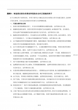 附件1:制造商应报告的事故和现场安全纠正措施的例子以下示例仅用于说明目的,并用于指导公司确定是否应向国家主管当局提交报告。这些例子旨在表明,在决定是否报告时有相当大的判断因素。一、可报告事件的示例1.患者在使用除颤器后死亡,并且存在除颤器有问题的迹象。这件事应该上报。2.根据制造商的说明,患者在使用外科透热疗法时被烧伤。如果烧伤严重,应该报告,因为这种严重的健康状况恶化通常是不会发生的。这件事应该上报。3.输液泵因泵故障而停止,但未能发出适当的警报;没有病人受伤。这应该报告,因为在不同的情况下,它可能会导致健康状况严重恶化。这件事应该上报。4.由于输液泵和所用的输液器不兼容,输液泵输送了错误的...