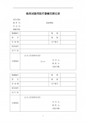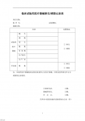 项目名称:批件号:试验期限:申办方:器械名称:器械编号数量型号规格有效期生产批号保存条件生产厂家交接情况□以上信息核对无误交付人:接收人:交接日期:器械编号数量型号规格有效期生产批号保存条件生产厂家交接情况□以上信息核对无误交付人:接收人:交接日期:2