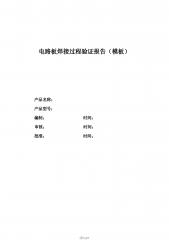 电路板焊接过程验证报告(模板)产品名称:产品型号:编制:时间:审核:时间:批准:时间:11.验证目的:检查并确认电路板焊接的参数及焊接的工艺,以确保产品能在正确的生产工艺下生产。2.验证范围:适用于……各电路板焊接或整机装配过程中的焊接。3.职责:序号工作职责工作部门1全面负责协调,安装运行确认研发部2根据检验结果出具报告,负责验证工作的现场监督质量部3提供工艺工求,准备验证物料,组织验证实施生产部4生产操作,维护保养,填写记录生产部5负责方案、报告的审批总经理4.程序:4.1安装确认:对焊接设备进行安装调试,符合设备基本性能要求,制定设备操作保养规程并在运行过程中按要求操作及保养。对设备控制...