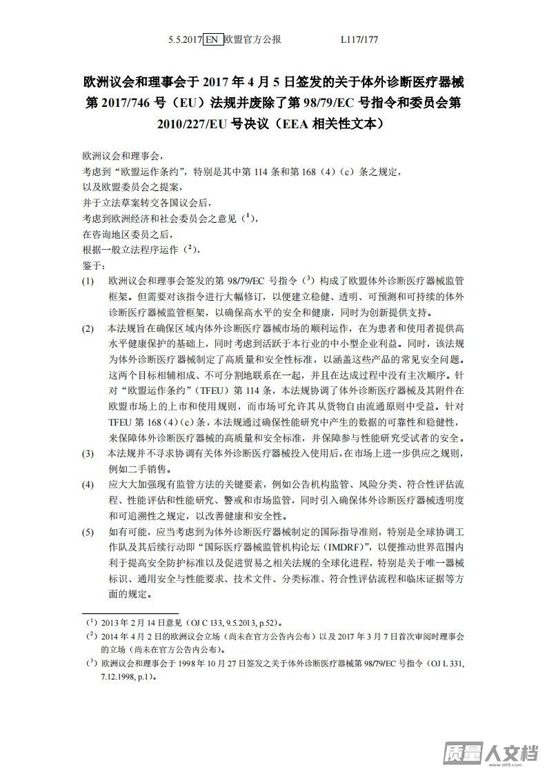 5.5.2017EN欧盟官方公报L117/177欧洲议会和理事会于2017年4月5日签发的关于体外诊断医疗器械第2017/746号(EU)法规并废除了第98/79/EC号指令和委员会第2010/227/EU号决议(EEA相关性文本)欧洲议会和理事会,考虑到“欧盟运作条约”,特别是其中第114条和第168(4)(c)条之规定,以及欧盟委员会之提案,并于立法草案转交各国议会后,考虑到欧洲经济和社会委员会之意见(1),在咨询地区委员之后,根据一般立法程序运作(2),鉴于:(1)欧洲议会和理事会签发的第98/79/EC号指令(3)构成了欧盟体外诊断医疗器械监管框架。但需要对该指令进行大幅修订,以便建立...